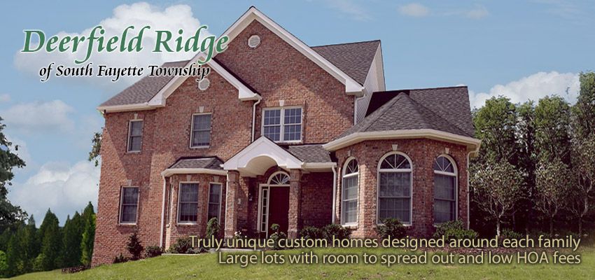 Paragon Homes, PittsburghÆs premier new homebuilder, is proud to offer our Deerfield Ridge custom home community. With wide-open green spaces, invigorating fresh air, and gorgeous natural scenery, Deerfield Ridge is a true showcase community for even the most discerning of homebuyers. Each lot features plenty of personal outdoor living space for gatherings both large and small. And with 24 spacious custom home sites that one must see to truly appreciate, Deerfield Ridge promises to delight. Perfectly situated in the family-friendly suburbs and right in the heart of the top-ranked South Fayette school district, Deerfield Ridge is just minutes to Robinson, Southpointe and Downtown Pittsburgh.