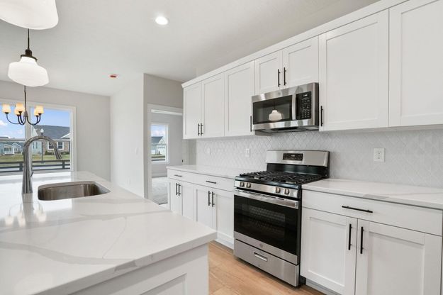 First floor owners suite with luxury finishes, home office and rear covered porch. Kitchen includes s/s dishwasher, gas stove and microwave with exterior venting, large island and quartz countertops. Home has open layout with gas fireplace and 10' ceilings in the great room. First floor home office and guest room with private bath on second floor. HOA maintains the lawn, landscaping and removes snow from driveways, sidewalks and streets.