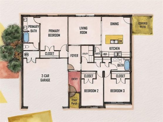 This 3 bed, 2 bath home makes every inch count, with a bright open plan and a big backyard ready for whatever you dream up. The kitchen gives you great flow, a handy pantry, and plenty of workspace to keep life moving. The primary suite offers a spacious feel, with a jetted tub (with shower over tub) for relaxing at the end of the day, plus a separate toilet room for a little extra privacy. Built-in storage shines here too—with two oversized linen closets right off the main hall and a tidy utility space that keeps things running smooth. And don’t miss the two-car garage, ready for cars, tools, or whatever else needs a home. Construction is underway—reach out soon and you might still have time to personalize some of the final touches. Keep on the lookout for updates and new renderings/photos--this is going to be a cute one! Listing agent is related to seller.