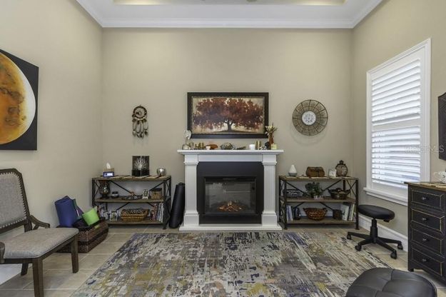Welcome to your dream home in the highly desirable gated community of The Woodlands at Longleaf where luxury living meets exceptional value. This community is golf cart friendly and features two club houses, two community pools with spa, tennis and basketball courts and miles of paved walking and biking trails surrounded by beautiful ponds and lakes. Convenient to Schools, grocery stores, restaurants and upscale shopping. When you arrive you will appreciate the curb appeal of this homes modern styling featuring: rock fascia’s, architectural columns and a beautiful four color paint scheme. This single story home was custom built in 2021 by: Homes by Westbay. It offers an award winning floor plan with a huge open-concept grand room with dramatic 12ft ceilings and a rear facing 25ft wide sliding glass door to take in the expansive pond view. It is over 425ft to the tranquil tree lined sanctuary behind this lot. Enjoy your coffee in peace and quiet each morning while watching birds, deer and native wildlife. A gorgeous paver stone driveway and walkway leads to an inviting 13’x 20’ covered front porch seating area with a ceiling fan for relaxing or socializing with new neighbors. The front door features full length decorative etched glass panes. Step inside the front door where you are greeted by elegant 12ft tray ceilings with double cove moldings. The contemporary chandelier above lights the beautiful 12” x 24” porcelain tile floors below that flow throughout. The 17ft long hallway has an archway with built in columns. The hallway leads past double glass doors of the den on the left. Solid double doors on the right open up to a cozy private living or dining room space with 12ft tray ceilings and an electric fireplace. Walk into the impressive grand room featuring beautiful architectural ceiling beams, 12ft ceilings with the focal point being a beautiful 99 inch art-deco ceiling fan that keeps the entire room cool and comfortable. The gorgeous gourmet Kitchen has dark espresso cabinetry high-lighted by beautifully marbled granite countertops and a custom installed color-matched decorative tile backsplash. The gas cook top has 5 burners and a stainless steel range hood with high performance exhaust fan. Top-of-line Stainless G.E.Café appliances throughout. The huge center island has a deep oversize stainless sink with disposal and Moen designer pull out faucet. The center islands granite countertop comfortably seats six adults on leather bar stools. The entire grand room and kitchen are illuminated by (21) can lights (2) hanging pendant lights with low voltage over and under cabinet accent lighting. All lighting throughout the home is on dimmer switches for mood lighting capabilities. The living room area has an 85” wall mounted Smart T.V. that can be viewed from the dining table behind that seats up to (10) making it great for watching the news or a game during dinner. This home was specifically positioned on the lot for a future oversize backyard pool and spa. The home was pre-wired for pool power and natural gas stub outs at the back and rear corner. The A/C unit was set to one side to utilize the entire 33 x 58ft area. The bathroom next to the lanai has an exterior door for future pool bath use. The Master suite entry has tall 8ft double doors with an inset archway detail. The Master suite encompasses one whole side of the home providing seclusion and privacy. The large bedroom is 14 x 21 with 10ft tray ceilings with double cove
