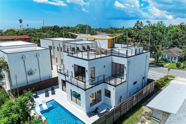 Welcome to this beautifully crafted 4-bedroom, 5-bathroom pool home with a 2-car garage, located in one of the best areas of Sarasota. Built in 2025, this residence showcases modern elegance blended seamlessly with the laid-back charm of Florida living. From the moment you arrive, you'll appreciate the home's refined curb appeal, highlighted by its neutral palette, expansive floor tiles throughout, recessed LED lighting, and high-end Level 5 smooth wall finishes. Step inside to a thoughtfully designed open-concept layout that connects the living, dining, and kitchen areas, creating an ideal setting for entertaining or everyday living. The chef-inspired kitchen features a double oven, a spacious island with seating, a built-in wine fridge, and ample storage. Large sliding glass doors in the dining area open directly to the backyard, creating an effortless indoor and outdoor lifestyle. An outdoor kitchen makes al fresco dining easy, while the private pool transforms the space into a resort-style retreat. The primary suite is a true sanctuary, complete with a walk-in closet and a luxurious en-suite bathroom featuring dual vanities, generous cabinet storage, modern lighting, and a sleek walk-in shower. Two additional bedrooms are ideal for guests or family, each offering upgraded closet systems. A second full bathroom provides a double vanity and a tub and shower combination, echoing the home’s upscale design. Working from home or needing a private space, the dedicated office area offers the flexibility to be transformed into a den, creative studio, or study. The laundry room is fully equipped with washer and dryer units for added convenience, and the oversized 2-car garage features an epoxy-coated floor for both functionality and visual appeal. Outdoor living is elevated with a large covered patio space perfect for lounging or dining al fresco. The beautifully paved area overlooks a peaceful backyard and a refreshing pool with a waterfall feature, offering your own private oasis. Multiple access points throughout the home lead to terrace-style balconies, ideal for soaking in the Florida sunshine and views. As a bonus, the rooftop den provides an exclusive space to relax or entertain, complete with impressive cityscape views, the perfect spot for sunset cocktails or quiet mornings. Beyond its stunning design, this property also presents a vacation rental investment opportunity for investors looking to move their money via a 1031 exchange, with gross annual revenue of up to $221,000! Additionally, with its DTN zoning, the home offers the unique ability to operate low-intensity professional businesses such as medical, wellness, or design services while welcoming clients directly to a dedicated front section of the residence. Just steps from Main Street, a neighborhood park, and a boat ramp, this home offers unmatched convenience. The marina and Sarasota’s lively downtown are only minutes away, giving you easy access to the city’s best dining, shopping, and entertainment. Half a block from Gillespie Park with its tennis courts and green space and close to the new 50-acre Bay Sarasota Park, you’ll enjoy expansive lawns, cultural venues, and recreational areas for outdoor enjoyment. Schedule a showing today and experience this exceptional Sarasota home for yourself.