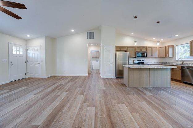 Construction has just been completed on this beautiful, single story home. House sits on a large lot on a quiet street, close to local schools. Inside, you'll find a nice, open floor plan complete with cathedral ceilings over the kitchen, dining, and living spaces. Kitchen comes complete with soft close drawers, island with seating, ample pantry space, and appliances. The master suite offers a walk in shower, double vanity, and connected walk in closet. This low maintenance home is energy efficient with central air, electric water heater, and forced air heat pump. Hurry, this home won't last long!