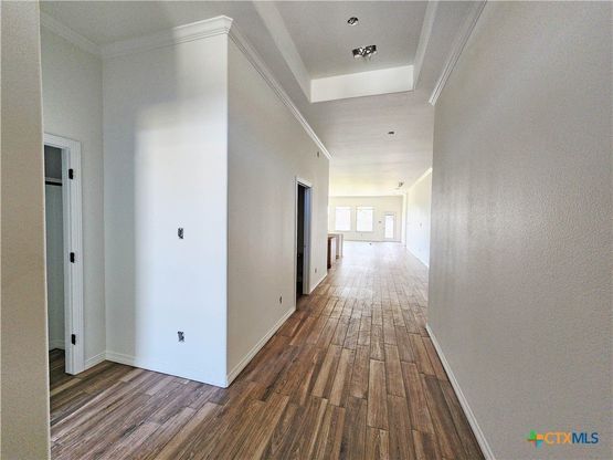 Experience refined elegance in the Stonewall Plan, a beautifully crafted 4-bedroom, 3-bath residence with a 3-car garage and over 2,400 square feet of upscale living space. Located in the highly desirable Three Creeks community, this home offers access to picturesque walking trails and is just minutes from the serene Stillhouse Lake. Built by Carothers Executive Homes, this residence showcases top-tier finishes and meticulous attention to detail throughout. The gourmet kitchen is a chef's dream, featuring a center island, premium cabinetry, and a spacious walk-in pantry with custom shelving. The open-concept living area is anchored by a sleek electric fireplace, perfect for cozy gatherings. The primary suite is a luxurious retreat with a vaulted beam ceiling, a spa-inspired bath, and a generous walk-in closet. Each secondary bedroom includes its own walk-in closet, ensuring ample storage for all. A mud bench at the garage entry adds both style and functionality. From the thoughtful layout to the high-end finishes, this home exemplifies the quality and craftsmanship that define Carothers Executive Homes.