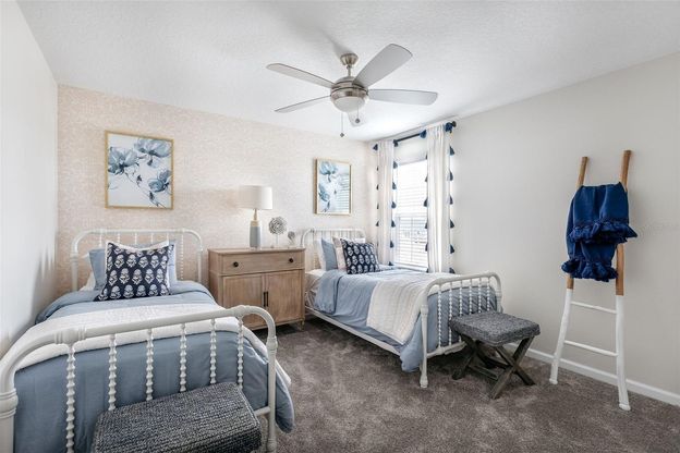 Why wait to build when you can own this stunning former model home, perfectly situated on a premium pond-view lot with no rear neighbors—an ideal backdrop for creating your private outdoor oasis. Designed for both comfort and functionality, this spacious two-story floor plan separates living areas for maximum tranquility. The first floor features an open-concept design that seamlessly connects the kitchen, dining room, and living room—perfect for both family living and entertaining. The owner’s suite is conveniently located on the main level, offering a private retreat with a spa-inspired bathroom and a generous walk-in closet. Upstairs, four additional bedrooms are complemented by a versatile loft that serves as an additional gathering space for the household. The gourmet kitchen is both stylish and practical, boasting a stainless steel appliance package, a large center island with built-in sink and pull-down faucet, a multicycle dishwasher, and a spacious walk-in pantry. The dining area flows naturally into the living room, where sliding glass doors provide abundant natural light and easy access to outdoor living. With five bedrooms in total, this home is perfectly suited for large or multigenerational families, providing everyone with their own private haven. The upstairs bathroom is thoughtfully designed with dual sinks to streamline busy routines, while the open loft offers endless flexibility for work, play, or relaxation. Life at Storey Creek means enjoying resort-style amenities every day—swim in the community pool, play a game of tennis or basketball, walk the dog in the park, or let the kids run on the playground. Plus, lawn care is included, giving you more time to enjoy it all. With easy access to top schools, shopping, dining, and Central Florida’s best attractions—including Disney, Universal, Lake Nona Medical City, and Orlando International Airport—you’ll love the unbeatable convenience this location offers.