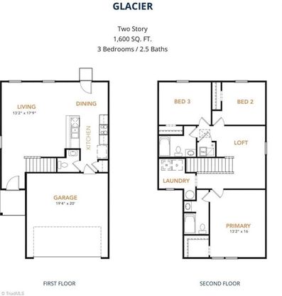 The Glacier plan by National HomeCorp is a thoughtfully designed two story home with 3 bedrooms, 2.5 bathrooms, and 1600 square feet of living space located approximately 2 miles from the new Purina Plant in Eden, NC. As you step inside, you'll pass the staircase to the upper level before arriving at the bright and open family room. This inviting space flows seamlessly into the kitchen and dining area, creating the perfect setting for family time or entertaining. A convenient half bath is located just off the kitchen for easy access. The upper level is designed for relaxation and privacy, featuring a spacious primary suite with a walk in closet and private bathroom. Two secondary bedrooms, a full bathroom and a laundry room complete this level. A large loft area provides additional space that's ideal for a kids den or home office! Seller will pay some closing costs when using NHC Mortgage and our attorney. Pictures are for illustrative purposes only and may be of home w same floorplan.