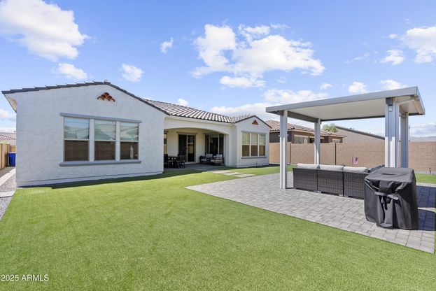 MODEL QUALITY Less than a year old. Stunning 2025 built Taylor Morrison Home in the sought-after Paradisi community! This home is loaded with upgrades including wood-look tile, plush carpet, quartz counters, stacked cabinetry with custom backsplash, premium appliances, canned lighting, framed mirrors, and a water softener system. Enjoy custom window trim & treatments, laundry room cabinetry, and ceiling fans throughout. The private backyard retreat features turf, pavers, walkway, and a pergola. Front yard turf and enhanced curb appeal complete the package. Situated on a premium N/S lot backing single-story homes. Save thousands with aftermarket upgrades versus building new! The community amenities include pools, clubhouse, parks, walking paths and more! Close to the shops at Prasada!