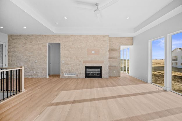 PRICE REDUCTION!!! Welcome to your new construction home in upscale Bentley Ridge in NW Urbandale, just a short walk from Radiant Point Elementary in the Waukee school district. This stunning, quality 2x6 constructed, 5-bdrm, 4-bath ranch home blends modern elegance, comfort and smart flow design. A stately stone entry connects to the full wall fireplace enhancing the inviting atmosphere of the great room. The design features expansive floor-level windows, creating bright, airy spaces with clean lines-combined with sleek white oak LVP flooring and a neutral palette for a sophisticated relaxed vibe. The kitchen delights with light quartz countertops, contemporary cabinetry, floating shelves, gas cooktop with direct vent exhaust, a double refrigerator/freezer, large walk-in pantry and an expansive island. The kitchen and baths have both gold and chrome fixtures for a variety of decor options. The primary suite is a serene retreat with a tray ceiling, elegant sconces, and a beautiful tile shower, dual vanity, separate make-up/styling counter, large closet with built-ins, and direct access to laundry room. Five handy pocket doors aid the smart floor plan, enhancing both flow and privacy. Completing the main floor is a 2nd bedroom, full bath, and a Den/Office or handy Playroom. The lower level is perfect for entertaining-featuring 9 ft ceilings throughout a huge family room with gas fireplace, an impressive wet bar, an over-sized guest half bath, and space for a pool table or play area. Bedrooms 3 and 4 include walk-in closets and share a full bath, while a versatile flex room can serve as a 5th bedroom, exercise, hobby, or school room. Now imagine having this home for your relaxing lifestyle. Whether you're a family with kids, a multi-generational group or empty-nesters this home will please all!