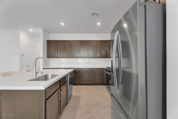 Welcome to Juniper Trails, a brand-new Beazer Homes community just minutes from the Las Vegas Strip, Allegiant Stadium, and world-class shopping and dining. This 3-bedroom townhome features a desirable primary bedroom downstairs, an oversized 2-car garage, and an open-concept layout with upgraded finishes. The kitchen shines with brown cabinetry accented by sleek silver hardware, elegant white quartz countertops, and stainless steel appliances. Additional highlights include a spacious pantry, designer light fixtures, and tile flooring. Enjoy both a covered porch and a balcony, perfect for indoor/outdoor living. Even better—this home is fully furnished, with all furniture included in the sales price. This is a rare end unit in like-new condition—move-in ready with every detail already taken care of.