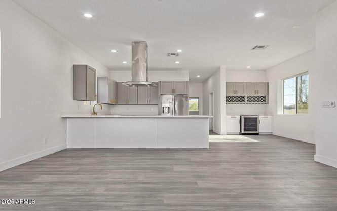 Sleek Modern Living Near Downtown! Welcome to this newly built two-story residence designed with contemporary finishes and clean lines. this home has an inviting great room with abundant natural light, wood-look flooring, and a fresh, neutral palette. The chef's kitchen is equipped with quartz countertops, custom cabinetry, stainless steel appliances, recessed lighting, and a large peninsula with breakfast bar seating. A wine bar with built-in cooler adds a perfect touch for entertaining. The spacious primary suite offers a spa-like retreat with a freestanding tub, oversized glass shower, dual sinks, His and Hers walk-in closet, private toilet room and two private balconies access—perfect for relaxing and enjoying the downtown phoenix view. Additional highlights include downstairs laundry with washer/dryer, energy-efficient design, and modern fixtures throughout. The oversized backyard with shade sail is a blank canvas ready for gatherings, recreation, or your dream outdoor oasis. Conveniently located near Downtown Phoenix, restaurants, and major freewaysthis home is move-in ready and built for today's lifestyle. Don't miss this opportunity!