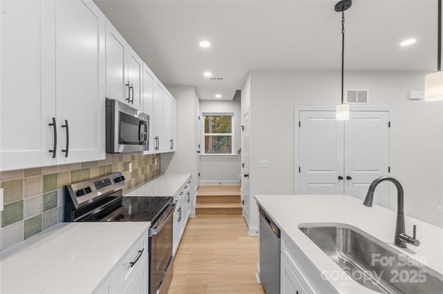MOVE IN READY packages now included - 6' privacy fence, refrigerator, washer, dryer & blinds. Builder/Lender offering 2-1 Rate Buy Down (rates in the 4's). Also qualifies for 100% Financing and $20,000 in Closing Costs! ONLY ONE LEFT - upgraded stunning new construction 3 bedroom single family homes located minutes from downtown Statesville. Open floorplan featuring 9 foot ceilings on both levels and luxurious finishes such as quartz countertops, white shaker cabinetry with soft close doors and dovetail drawers, designer tile in primary bathroom, subway tiled backsplash and pendant lighting. Turnkey move in ready home perfect for first time buyers and investors. Loaded with upgrades including white oak luxury vinyl plank flooring, stainless steel appliance package, large pantry, Moen plumbing fixtures and black hardware. Primary suite offers a spacious walk in closet and ensuite bath with shower. This home is complete with a rear patio overlooking a flat fenced in back yard. No HOA or rental restrictions, can be used for short term, mid term or long term rental!