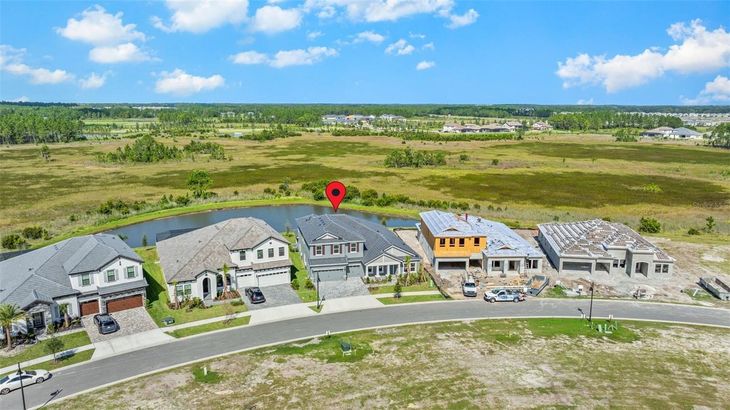 This is the only MOVE-IN READY Key West II model currently available in Two Rivers a rare opportunity to secure the largest floor plan in the community without waiting on new construction. Offering over 3,000 sq ft of bright, open living space, this home is designed for both comfort and functionality. The main level features an extended foyer, den, formal dining room, and expansive grand room with soaring 12’ ceilings that flow seamlessly into the chef’s kitchen and oversized island perfect for everyday living and entertaining. The kitchen comes fully equipped with a gas range, double oven, wine cooler, refrigerator, dishwasher, and microwave, making it ideal for home cooks and entertainers alike. Tile flooring runs throughout the first floor, while the second level offers carpeted comfort. A spacious owner’s retreat on the lower level includes a spa-style bathroom and oversized walk-in closet. Two additional bedrooms and a full bath are also located downstairs. Upstairs you’ll find a versatile bonus room, fourth bedroom, and another full bath ideal for a guest suite, office, or media space. Enjoy outdoor living on the covered lanai with beautiful pond views right from your backyard a serene backdrop for morning coffee or evening gatherings. Two Rivers is a thoughtfully planned community with scenic nature trails, outdoor recreation, and convenient access to Wesley Chapel’s shopping, dining, and schools—all within an easy drive to Tampa’s business, entertainment, and cultural districts.