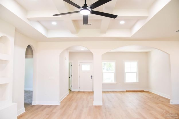Beautiful NEW CONSTRUCTION in Pensacola! Welcome to this stunning 4-bedroom, 2-bathroom home situated on nearly half an acre (.46 acres) just minutes from the interstate-offering both convenience & quiet. Step inside to discover LVP flooring throughout, arched openings, and a separate dining area. The living room features custom built-ins and a tray ceiling, adding depth and character to the space. The kitchen boasts black quartz countertops and comes fully equipped with refrigerator, stove, microwave, and dishwasher. The master suite includes an additional tray ceiling, tiled shower, and dual vanity for a touch of everyday luxury. Enjoy relaxing or entertaining on the back porch overlooking an expansive fenced yard. With thoughtful design, quality finishes, and a prime location, this home is a real head turner!