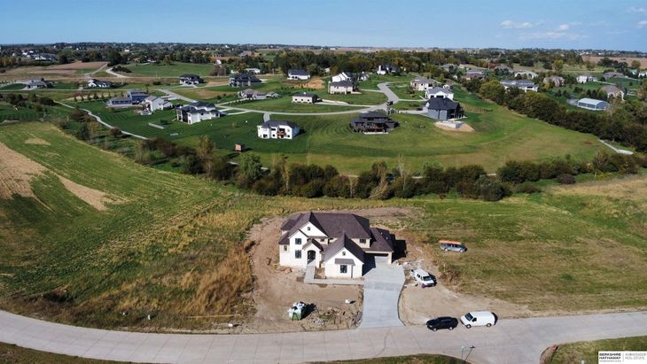 Joe Evans, M: 402-612-7993, joe3evans@gmail.com, https://www.bhhsamb.com - Acreage living awaits in this extraordinary 1.5-story home by iCON Homes, perfectly situated on 1.5 acres in the highly sought-after neighborhood The Estates at Wynnwood. Step inside and be captivated by the circular staircase, open great room with its striking floor-to-ceiling brick fireplace, a chef-inspired gourmet kitchen featuring a stunning waterfall island, and an expansive walk-in pantry. Your private oasis offers panoramic views of lush greenery and mature trees, creating an unparalleled sense of peace and privacy. The main floor boasts a luxurious primary suite with a spa-like bath, including a soaker tub, walk-in shower, and huge custom closet, plus a convenient home office. Upstairs, you’ll find three additional bedrooms, two baths, and a spacious bonus room. The lower level is an entertainer’s dream—complete with an 11 foot drooped floor gym, full bar, additional bedroom with bath, and a large rec r