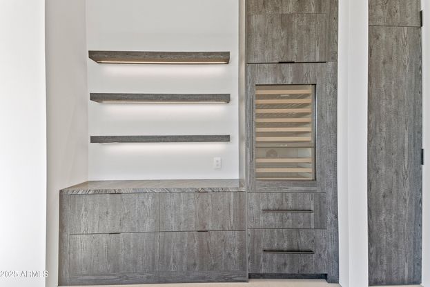 Newly completed, this 4 bedroom, 4.5 bath residence in Desert Mountain, Scottsdale, AZ embodies the art of modern living, designed for the Sonoran landscape by acclaimed architect Brian Raines. On an exceptionally private lot within one of Scottsdale's premier private golf communities. The beautifully curated landscape surrounds the home creating a stunning approach and incredible curb appeal that sets the tone for the refined experience within. As you enter through the stunning glass pivot door, the home opens into a grand yet welcoming great room, where towering floor-to-ceiling glass walls frame the mountains and the ever-shifting desert sky. The space is expansive and intimate, centered around a modern fireplace and a beautiful custom bar complete with a wine refrigerator, cooling drawer, and ice maker perfect for an elegant evening at home. At the center, a chef's kitchen tailored for the culinary purist. Outfitted with the highest-level appliance suite, it features a six-burner gas range, double ovens, integrated refrigerator and freezer, dishwasher, and a built-in Sub-Zero coffee and espresso maker. The expansive quartz island and custom cabinetry showcase the tailored craftsmanship. A fully equipped back kitchen extends the function of the main. Complete with its own refrigerator, cooling and freezer drawers, microwave, sink, dishwasher, and generous pantry storage, it provides an effortless way to host while maintaining visual serenity throughout the main space. The primary suite is a retreat of rare tranquility. A spa inspired bath features dual vanities, a freestanding soaking tub, and a glass shower. The double doors to the outdoors open to a private outdoor spa and shower, surrounded by native desert flora. The custom dressing room includes tailored storage and a built-in clothes steamer for pure luxury. Three well-appointed guest suites, each with a private ensuite bath, offer comfort for your guests. The front guest suite enjoys its own private entrance, making it an ideal space for a home office, art studio, or executive retreat, a thoughtful design detail that adapts beautifully to modern lifestyles. The laundry room mirrors that same attention to detail, with two full washer and dryer sets, another built-in steamer, and functional cabinetry designed for a clutter free environment. Outdoors, an expansive resort-style patio becomes an extension of the home itself. A large pool with a waterfall, integrated spa, and fire feature. And a covered sitting area with a fireplace, ideal for desert evenings. Every moment here feels intentional, grounded, and distinctly Desert Mountain. Completing the property is a five car garage, offering ample space for car enthusiasts or collectors, and another subtle mark of the home's thoughtful scale and refinement. Positioned within Desert Mountain's exclusive golf and lifestyle club, residents may apply for club membership to enjoy access to seven championship golf courses, private dining venues, spa, tennis courts, fitness center, private hiking, and 24-hour guard-gated security. Desert Mountain is Scottsdale's most Northern elevated community at the base of the Continental Mountains and within reach of Scottsdale's world-class restaurants, galleries, and luxury shopping.