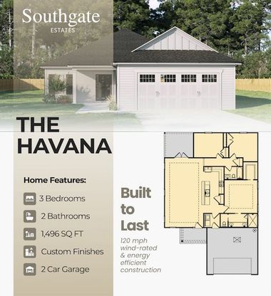 Welcome to your brand new home in Southgate Estates! The Havana floor plan offers the perfect blend of style, comfort, and functionality with just under 1500 square feet of thoughtfully designed living space with nine foot ceilings throughout. This single-story, three-bedroom, two bath home features an open-concept layout ideal for families and entertaining. Enjoy a spacious kitchen with granite countertops, pantry and under-cabinet lighting, covered back porch, and a laundry closet located just off the garage entry. You'll love the primary bedroom with spacious en suite bathroom with ceramic tile, a double vanity, separate toilet closet, and a large walk-in shower as well as a walk in closet. Across the house, you'll find two bedrooms and a hall bath to be easily accessed by bedrooms and guests alike. Built to Florida code and engineered to withstand 120 mph winds, this home offers peace of mind with cement board siding, a two-car attached garage, and pre-wiring for a backup generator. Located in Southgate Estates, this home is just minutes from the brand-new Publix (opening soon!), Home Depot, Tractor Supply, Harbor Freight, Walmart, and numerous dining options. Plus, with easy access to Tallahassee—just 40 miles away, you can enjoy small-town living with big-city convenience. Under construction now—don't miss your chance to own new construction in one of Bainbridge's newest and conveniently located neighborhoods!