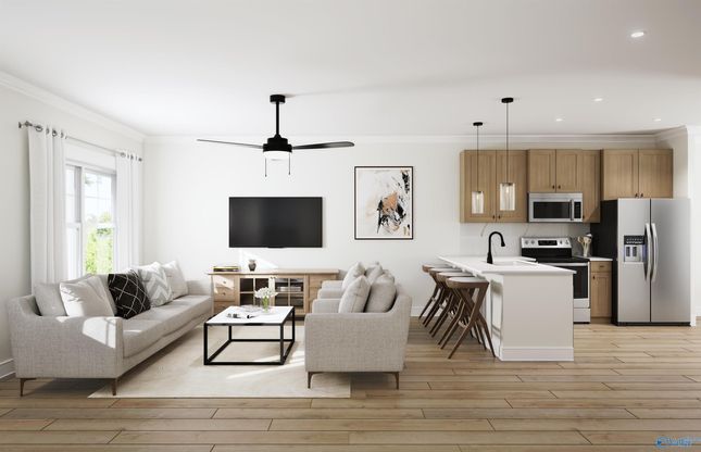 Under Construction-The Tyndall. THREE BEDROOMS and 3 FULL BATHS! One bedroom downstairs on the main w/full bath is perfect for guests or a home office. Upstairs you’ll find a spacious, secluded primary suite w/walk-in closet & dual vanity. The 3rd bedroom is on the opposite side of the house & also has a walk-in closet & its own full bathroom! Includes quartz countertops, stainless steel appliances, & luxury plank flooring on the main level. Storage unit attached to back patio for all your toys! Enjoy a low maintenance lifestyle as lawn care & exterior maintenance are a complimentary service. These introductory priced homes are the most affordable in HSV Metro. Photos/videos of a similar hom