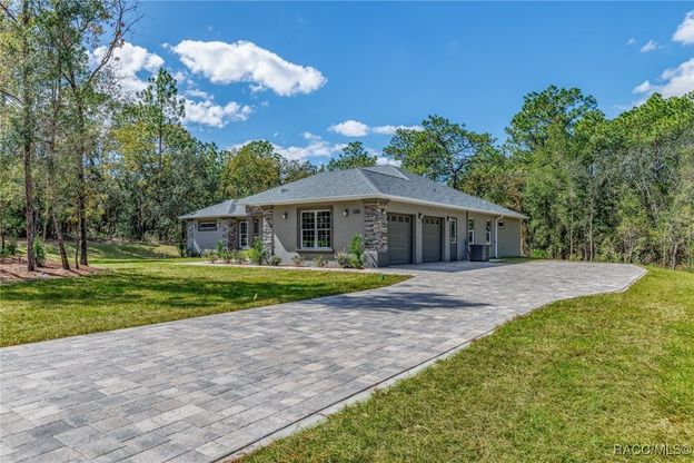 LIVE THE LIFE OF LUXURY IN THIS ELEGANT & SOPHISTICATED BRAND NEW QUALITY BUILT 3/2/2 & STUDY HOME WITH OVER 2577 SQ. FT. LIVING AREA SITUATED ON 1.3 ACRES IN PINE RIDGE! Beautiful upgraded finishes abound throughout the home, from the all paver driveway, to the beautiful custom double entry doors...generous sized Great room with 32x32 porcelain polished tile floors with Mapei mapguard waterproof & impact sound membrane under all the floor tile...to the double tray ceilings, to the sliders that open onto your covered lanai and beyond to the beautiful wooded view of the outdoors! Plenty of room for a pool & a summer kitchen! The cook in your home will love the spacious Chef style kitchen, with finishes in shades of grey, with all GE s/s appliances, under cabinet lighting, soft closing drawers, wood cabinets, lots of Quartz counter-tops, stainless farm sink & maui-wave basket weave glass backsplash. Big center island with electric and deep drawers for pots & pans; Walk in pantry; Breakfast nook & large dinning room for entertaining & holiday dinners! Study has lots of natural light & double glass doors off of the great room; Modern lighting fixtures & ceiling fans throughout. Owners suite bedroom has 2 large walk in closets, and the most luxurious masterbath you will find! Separate vanities both with lighted LED wall mirrors (no fog sensor), deep stand alone soaker tub, and the huge walk in double shower, beautifully tiled, with double rain shower heads & shower heads! Guest bath with lots of upgrades! Carpet in bedrooms; Laundry room with cabinets and sink; Double garage doors & garage floor is completed with flaked coat finish. 1 Year builder warranty; Sprinker system; fully landscaped and sodded. Pine Ridge is a restricted Equestrian community with 28 miles of riding trails throughout, equestrian club house, dog park, tennis courts, shuffleboard, playground, Radio controlled air craft field, and lots of clubs! Only minutes to the Suncoast Parkway & 1 hour from the Tampa International Airport. 45 minutes to Ocala & the World Equestrian Center. Only a few miles from all the new Black Diamond Shoppes at the corner of 486 & 491 in Lecanto....Shopping, banking & restaurants!