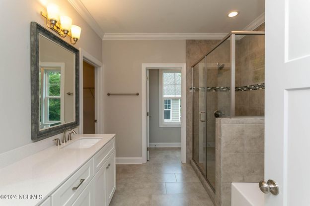 Beautiful new construction in great location close to downtown Aberdeen offers an incredibly open, bright floorplan. The main level has LVP flooring and crown molding in the living areas. A spacious living room has an electric fireplace and ceiling fan and is open to the kitchen with white wood cabinetry, quartz counters, tile backsplash, and island, and dining area. There is a bright Carolina room with glass door to a back patio. The main level also has a powder room with pedestal sink and tile floor. The upper level has crown molding throughout, It includes the primary bedroom with tray ceiling, ceiling fan with light fixture, carpet, walk-in closet and en-suite bath with double sink vanity, garden tub, step-in tile shower, water closet and tile floor. There are two more bedrooms with carpet, full bath and laundry closet. The home is convenient to local shopping and dining as well as Fort Liberty.