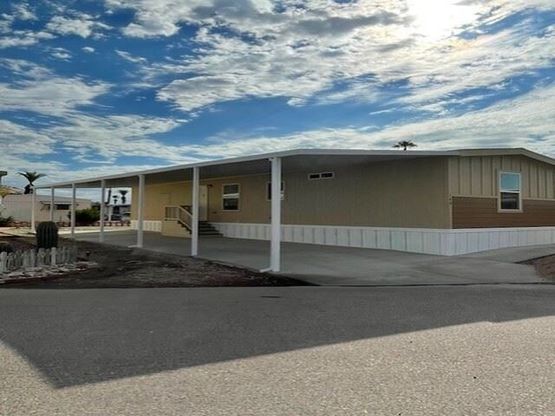 Fairview Manor, begin your life here. A beautiful 55+Community. Pool, Spa, Clubhouse, Fitness Room all at your disposal. This home is a brand new 2026 Champion Home 2 Bedroom 2 Bath. Includes all your most modern stainless appliances, Refrigerator, Stove, Microwave, Dishwasher and Garbage Disposal. All your window coverings included. Washer and Dryer Hookups in place. Wide hallways allowing for freedom of movement, the most beautiful flooring throughout. The most beautiful ceiling fans in place complementing the Stainless Decor and Appliances. All your Desert Landscaping in place making yard work minimal. You are going to Love this home. Reach out NOW to schedule your tour of this home, it can be yours.