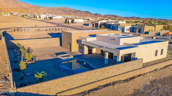 Welcome to Trinity, the newest community in Lake Havasu Foothills Estates! This move-in ready home sits on a quiet cul-de-sac surrounded by upscale homes and peaceful desert scenery. From the moment you walk in, the bright open layout, 14-foot ceilings, and large sliders create a warm, inviting space that feels fresh and ready to enjoy. The kitchen, dining, and living areas flow together seamlessly-perfect for casual gatherings or quiet evenings at home. Step outside to a huge backyard built for Havasu living! A pool and spa sit at the center of the space, surrounded by easy-care landscaping and plenty of room for entertaining, sunbathing, or relaxing under the desert sky. The double RV garage is fully finished with epoxy floors, insulated doors, dual mini-split A/C units, and a soft-water hose bib for spot-free rinsing of your boat, car, or toys. Every feature of this home is designed for effortless desert living-low maintenance, high comfort, and completely move-in ready. Just bring your toothbrush and start enjoying life in Havasu!