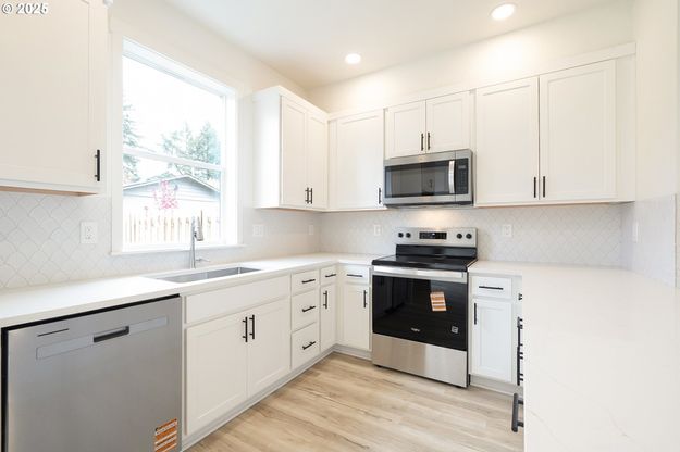 OPEN HOUSE SUNDAY DECEEMBER 7th from 1:30 to 3:30 pm. Brand new construction with 3 bedrooms, 2 1/2 bathrooms, garage and a large fenced yard. This home sits well off Powell Blvd along with three additional homes. All four homes come with an available 10 YEAR PROPERTY TAX ABATEMENT! Typical property taxes with tax abatement run $900 to $1,200 per year. The kitchen comes with a stylish hood vent, quartz counter tops with a eat bar and stainless steel appliances. For a limited time this home comes with a free refrigerator, window coverings, washer and dryer! The main floor has 9' ceilings and luxury vinyl plank floors. Three bedrooms upstairs with vaulted ceilings, primary bedroom has a walk in closet and full bathroom. [Home Energy Score = 8. HES Report