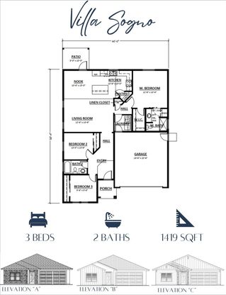 Welcome to Smee Homes' Villa Sogno. This 1419 square foot home is a real dream home with 3 bedrooms, 2 bathrooms, and a split floor plan. Upon entering the home, you are welcomed with 2 bedrooms and a guest bath conveniently set apart from the living room and primary suite. As you enter the living space you will encounter vaulted ceilings and a large island as you enter the kitchen. A large pantry provides ample space for food and supplies. The back door just off the dining nook welcomes you into the back yard and covered patio. The primary suite has its own private bathroom with tub and shower upgrade or expanded shower. Add a barn door for added privacy. Call SHI sales agent for more information. *Individual finishes vary.