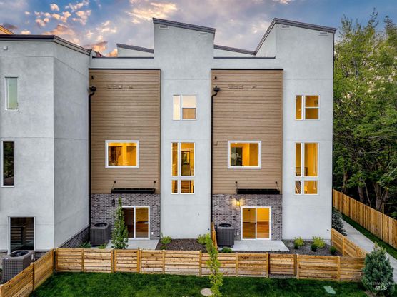 Rooftop Living at its finest! Boise23 offers high-style, low-maintenance living in architecturally modern, vertically designed single-family townhomes featuring ingenious floor plans, elevated interior finishes, and seamless indoor/outdoor integration. Expansive windows throughout fill the home with natural light and capture wide-open views from multiple levels. Enjoy an impressive array of outdoor spaces—including a private rear yard, a spacious rooftop patio perfect for entertaining, and an additional balcony off the main living area. The first floor welcomes you with a bright foyer leading to a versatile bonus room that opens directly to the backyard, along with access to a generously sized 2-car garage offering ample storage. Upstairs, the second level showcases a light-filled open-concept layout with a modern kitchen, dining area, powder bath, and an inviting great room that extends out to a covered balcony. The third floor hosts both the primary and secondary bedrooms, each featuring ensuite bathrooms for comfort and privacy. The luxurious 5-piece primary bath boasts a freestanding soaking tub, striking finishes, and a spacious walk-in closet. Ascend to the fourth floor to discover a stunning rooftop parlor complete with a wet bar, a third bedroom, a full bath, and panoramic views—creating a perfect setting for gatherings, sunset watching, or relaxing under the stars.