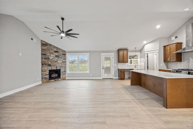 Discover this beautifully crafted 1,931 sq ft single-level new construction home, designed to blend contemporary style with everyday functionality. Offering 3 generous bedrooms and 2 well-appointed bathrooms, the home features a cozy ventless fireplace, custom shelving, and a spacious open layout ideal for gathering or unwinding. The kitchen stands out with sleek quartz surfaces, warm wood-stained cabinets, stainless steel appliances, a large center island, and an expansive walk-in pantry that provides exceptional storage. The primary suite offers a serene escape with a tray ceiling, built-ins, and a spa-like bathroom complete with dual vanities, a soaking tub, and a tiled walk-in shower. Practical touches are found throughout, including a mudroom conveniently located off the garage and an oversized laundry room with ample cabinetry. Outdoors, the covered back patio overlooks more than an acre of land-perfect for entertaining or enjoying a peaceful evening at home. Thoughtful finishes and upscale details make this home truly one of a kind.