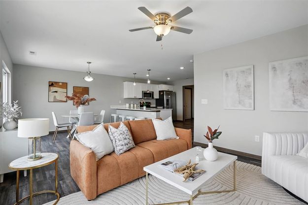 New construction interior zero-lot unit with functional layout and modern finishes. *Photos/media of similar unit.* This 3-bedroom, 2.5-bathroom home offers an open main level with an L-shaped kitchen featuring stainless steel appliances and a breakfast bar adjacent to the dining and living areas. Sliding door leads to a patio and open backyard with expansive views backing up to Veritas Church—no rear neighbors for a sense of space and privacy. The main floor also includes a convenient powder room and a combined mud/laundry room off the garage entry. Upstairs you'll find three bedrooms, including a primary suite with a walk-in closet and double vanity en suite. A full hall bath serves the additional bedrooms. Easy access to I-380, I-80 and close to shopping, dining, and everyday essentials make this a practical choice for a variety of lifestyles. Schedule a showing today!