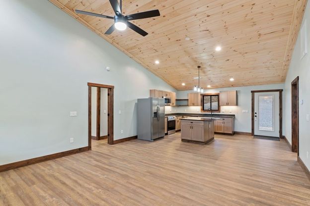 Experience modern mountain living at its finest in this beautifully crafted 2025 new-construction home, ideally situated on 1.65 private, unrestricted acres in highly desirable Fannin County. Designed with comfort, style, and functionality in mind, this single-level ranch-style retreat offers 2 bedrooms, 2 bathrooms, and quality finishes throughout. Inside, the open-concept layout welcomes you with a spacious family and dining room combination highlighted by cathedral ceilings, a striking fireplace, and abundant windows that fill the space with natural light and showcase peaceful wooded views. The kitchen offers an inviting eat-in bar ideal for casual dining, complemented by luxury vinyl plank flooring and a tasteful blend of wood and tile finishes that create both warmth and low-maintenance living. A pantry adds convenience and storage. The owner's suite provides a relaxing retreat with a walk-in closet and a beautifully designed ensuite bathroom featuring a tile shower, double vanity, and linen closet. The second bedroom is generously sized and located near the second full bath, perfect for guests or family. Both bedrooms are large enough to fit a king-size bed with plenty of room for other furnishings. The exterior features low-maintenance Smart Siding, a durable metal roof, and expansive outdoor living spaces to enjoy the serene, wooded surroundings. A 10' x 42' main-level deck provides the ideal space for morning coffee or evening relaxation. Below, you'll find a 420 sq ft heated and cooled unfinished basement (exterior access only)—ready to become storage, a bunk room, man cave, or whatever fits your vision. The 840 sq ft covered lower-level deck includes water and power, making it perfect for a hot tub and creating your ultimate party or entertainment area. No restrictions give you the freedom to use the property as you wish. Whether you're looking for a full-time residence, weekend escape, or a lucrative vacation rental, this brand-new, move-in-ready home of