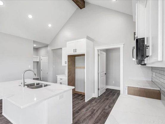 Welcome to this stunning new home, where modern design meets timeless elegance. Featuring an open-concept layout, this home flows seamlessly from the spacious living room to the gourmet kitchen, perfect for both everyday living and entertaining. The beautiful, stained beam in the kitchen and living room add warmth and character, complementing the sleek gray brick exterior that exudes contemporary charm. Inside, the gray and white color palette creates a serene, sophisticated atmosphere, with quartz countertops throughout that elevate the space. The kitchen is a chef's dream with ample counter space and premium finishes, while the adjacent living area offers plenty of room to relax or host guests. The large lot provides an abundance of outdoor space, with a charming, covered porch that's perfect for enjoying quiet mornings or evening sunsets. The luxurious master bath boasts a tiled shower, offering a spa-like experience every day. This home is designed for comfort, style, and functionality, making it the ideal retreat for those seeking both beauty and practicality.