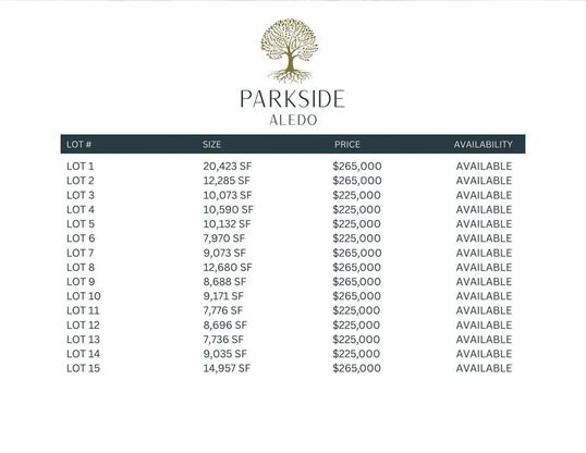 Parkside Aledo - an exclusive residential enclave in the heart of Aledo. Ideally situated just south of downtown, directly across from Bearcat Park and bordering Mockingbird Park, this community offers both convenience and charm. With only 15 homesites available, Parkside Aledo presents a rare opportunity to build within one of the region’s most sought-after school districts, complete with full city services. Even more appealing, the neighborhood is free from PIDs, MUDs, and high HOA dues. Homesites are projected to range from $225,000 to $265,000, with custom residences anticipated between $1M and $2M. Developer anticipates lot delivery in May 2026