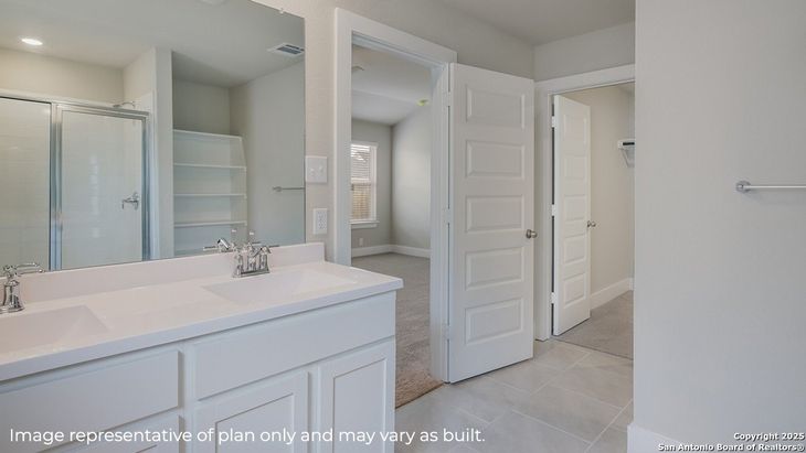 Step into The Kingston floor plan at Brookstone Creek located in San Antonio, TX, a single story home offering 4 bedrooms and 2 bathrooms. This home also features 2 classic front exteriors, a 2-car garage and 2024 square feet of comfortable living. The Kingston features and open-concept layout that blends together to form the perfect space for everyday living. An inviting foyer welcomes you into the kitchen, complete with a natural gas cooking range, stainless steel appliances, subjway tile backsplash, quartz countertops and shaker style cabinets. The kitchen island faces the dining area and living room and offers a deep, single bowl sink and extra countertop space, perfect for bar seating. The private main bedroom suite is located off the living room towards the back of the home and features quality carpet, large windows and a ceiling fan. Your connected bathroom is an oasis, complete with dual vanity sinks, cultured marble countertops, a tiled walk-in shower, shaker style cabinets and a separate room for the toilet. You'll have all the space you need to get ready in the morning with a large walk-in closet. You'll find quality carpet and closets in all of your secondary bedrooms, which can also be used as offices, play rooms or other bonus rooms. Head out the back door located off the living room to find the rear covered patio (per plan) and full yard landscaping & irrigation. Additional features of The Kingston include hard surface flooring at entry, downstairs, halls, living room, kitchen, and dining/breakfast area, tile in all bathrooms and utility room, pre-plumb for water softener loop and faux wood window blinds throughoutt the home. This home also includes our HOME IS CONNECTED base package. Using one central hub that talks to all the devices in your home, you can control the lights, thermostat and locks, all from your cellular device.