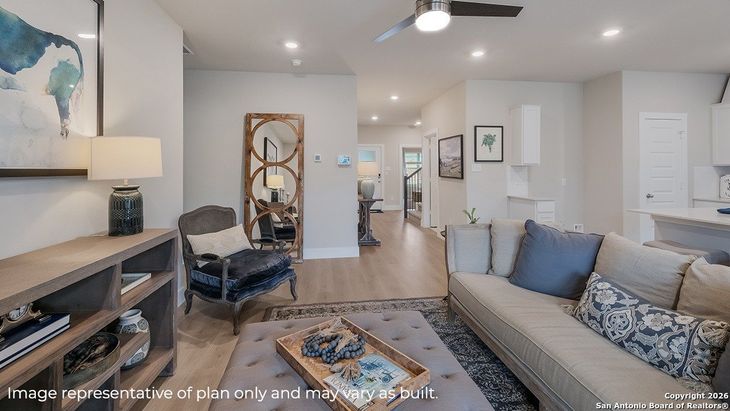 Welcome to The Naples, a gorgeous two-story home located at Brookstone Creek in San Antonio, TX. This floor plan offers 2 classic exteriors and a spacious 2-car garage. An inviting front porch welcomes you inside this 4 bedroom, 3 bathrom home situated across 2293 sq. ft. of living space. Follow the foyer down to an open concept living room, dining nook and kitchen with a spacious corner pantry. Your gourmet kitchen also includes stainless steel appliances, a natural gas cooking range, easy-mainentance quartz countertops and an eat-in kitchen island overlooking the living room. A deep, single basin sink located at the kitchen island makes washing dishes a breeze! A covered back patio (per plan) is located toward the back of the home off the dining area. Take a load off and relax with your loved ones in a fully landscaping and irrigated back yard with Bermuda sod. The primary bedroom is located downstairs off the living room and offers quality carpet flooring, large windows, a ceiling fan and a spacious ensuite bathroom. You'll enjoy dual vanity sinks, stylish shaker cabinetry and a large walk-in closet with tile surround. Your toilet is located through a separate doorway, ensuiring maximum privacy. The primary bedroom walk-in closet is a standout of this floor plan with plenty of storage space. Upstairs you will find an open loft or game room space, perfect for lounging, a third full bathroom and two additional secondary bedrooms. These rooms are versatile and can be set up as offices, home gyms or other spaces. All come complete with carpet flooring and closets. Additional features of The Naples include hard surface flooring at the entry, downstairs, halls, living room, kitchen, and dining/breakfast area, ceramic tile in all bathrooms and utility room, pre-plumb for water softener loop, and faux wood window blinds. Finally, this home includes our HOME IS CONNECTED base package. Using one central hub that talks to all the devices in your home, you can control the lights, thermostat and locks, all from your cellular device.