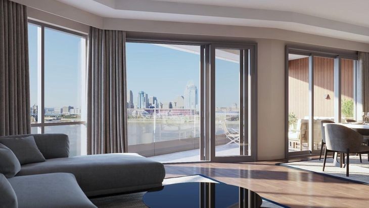 The Boardwalk Residences at Ovation are located on the riverfront with unobstructed views of the Ohio River and downtown Cincinnati. Pricing is based on floor and building location and averages $975,000. All residences have 2 bedrooms, 2 full bathrooms, Wolf and Subzero appliances, custom primary closets, and most with 2 balconies. All residences will have direct elevator access from the secured parking garage directly to their own private elevator lobby. In addition, the Boardwalk Residences at Ovation will enjoy a completely walkable community with retail, dining, and entertainment. Amenities will include access to a state-of-the-art membership club featuring a full-service spa, group exercise classes, his and her locker rooms, and dedicated floors for both cardio and free weights, all nestled around a heated roof deck pool. The club will also include event space for meetings, a member's lounge, and an indoor/outdoor bar for entertaining.