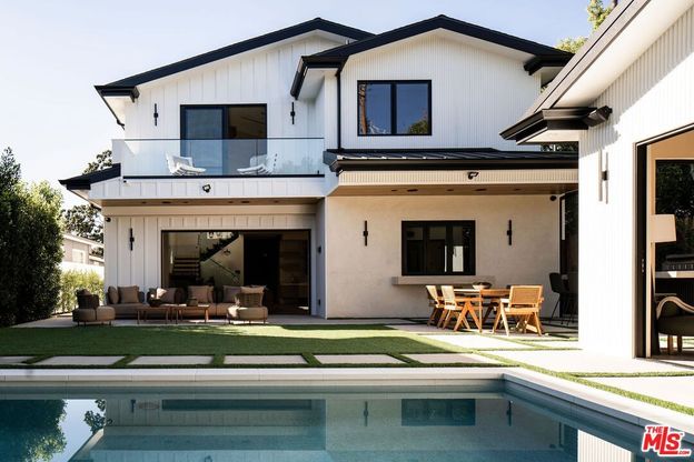 Defined by craftsmanship and intention, this new construction gated residence on Kraft Avenue presents a refined take on contemporary luxury in the heart of the Colfax Meadows. Conceived with an emphasis on proportion and materiality, this five bedroom, six bathroom home features high ceilings, natural materials, white oak floors, and custom details throughout. The composed open layout connects formal living and dining spaces to a chef's kitchen anchored by an oversize travertine island, a full suite of Thermador appliances, custom range hood, pot filler, and a service window bar for effortless entertaining. In the living room, a floor to ceiling travertine fireplace serves as a striking architectural focal point while also creating a cozy ambiance. Expansive glass pocket doors tuck away and open to a private backyard with a resort style pool and spa, built in barbecue, covered patio, and a curated outdoor space. One ensuite bedroom is thoughtfully placed on the main level, while the second level is anchored by a serene primary suite with a private balcony, spa inspired bath, and custom walk in closet, complemented by three additional bedrooms. A detached guest house featuring a sitting area, wet bar and an adjacent bath enhances the backyard experience, offering a refined space for lounging or hosting. Tech-forward features include a Control4 smart system, integrated security, cameras, and multi-zoned HVAC. Located within the Carpenter School District and moments from Ventura Boulevard and major studios, this residence balances discretion, design, and lifestyle.