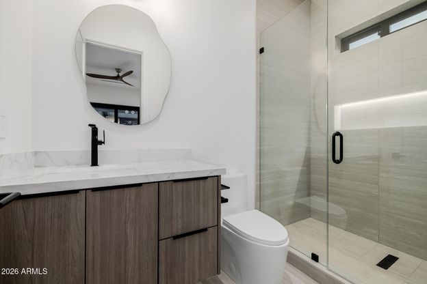 BRAND NEW 2026 construction offering a rare opportunity to own a true architectural masterpiece in one of Scottsdale's most desirable locations. This exceptional residence showcases supreme craftsmanship, striking design, and timeless elegance throughout. From the moment you arrive, the home's architectural presence captivates. Step into a grand living room with soaring ceilings accented by dramatic LED design, creating an unforgettable first impression. All rooms are generously proportioned, enhancing the home's open, airy feel. The residence features the highest-grade tile flooring throughout-not a spec of carpet. The kitchen is not just stunning but also equipped to please the fussiest chef. Equipped with top-of-the-line appliances, designer cabinetry, curated lighting. The elegant dining area is ideal for hosting elevated dinner parties and gatherings.The primary suite is a private sanctuary, featuring a custom accent wall with integrated LED lighting, direct access to the backyard through a sliding door, and a refined interior design. The spa-like primary bathroom boasts premium finishes, a luxurious layout, and exceptional attention to detail. A large walk-in closet with built-in cabinetry completes the suite - perfect home for your fashion. Multiple smart toilets in the home! Designed for the ultimate indoor-outdoor lifestyle, expansive sliding doors lead to a breathtaking backyard retreat. Enjoy a large covered patio with surround sound, a heated pool, and a fully equipped outdoor kitchenperfect for entertaining or unwinding in complete privacy under Arizona's blue skies. The home is enhanced with a premium Sonos surround sound system throughout the main living areas, patio, primary suite, primary bathroom, and primary closeteach space featuring its own independent sound controller. Additionally, seven strategically placed security cameras allow monitoring directly through the home system or via mobile device, providing peace of mind and modern convenience. Located just minutes from Chaparral Park and close to Scottsdale's premier dining, shopping, entertainment, sports venues, and top-rated schools, this home delivers luxury living at its absolute finest.