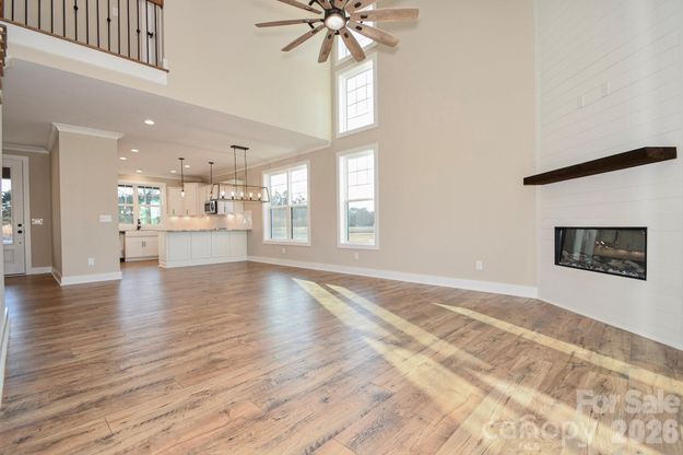Stunning New Construction with Thoughtful Design & Premium Finishes Welcome to this beautifully crafted new-construction home offering 3 bedrooms, 2.5 baths, and a spacious bonus room with a walk-in closet that can be used for many purposes. With 1,986 sq ft of living space, this open-concept layout features a dramatic two-story living room highlighted by an electric fireplace with a cedar mantle and floor-to-ceiling shiplap. The main-level primary suite offers privacy and comfort, complete with a walk-in closet and a luxurious tiled walk-in shower. All bedrooms include walk-in closets, providing ample storage throughout the home. Wood flooring flows through the main living areas, with cozy carpeting in bedrooms and tile flooring in all bathrooms. The kitchen is designed to impress with abundant staggered cabinetry, generous countertop space, a breakfast bar, and under-cabinet lighting-perfect for both everyday living and entertaining. Additional features include crown moulding throughout, upgraded plumbing and light fixtures, an upstairs loft overlooking the living area, and a whole-home water filtration system. Enjoy outdoor living with a charming rocking-chair front porch, rear patio, and a large backyard ideal for relaxing or hosting guests. This home offers a stunning layout, quality craftsmanship, and modern upgrades throughout-truly a must-see.
