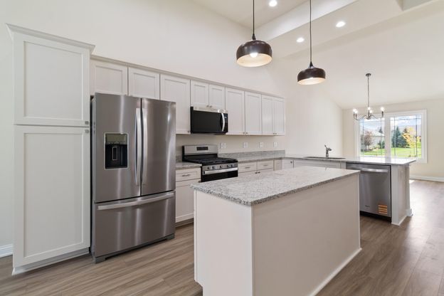 Proposed Construction. 1838 sq ft, of open concept living with 3 bedrooms, 2 baths, FULL BASEMENT. 2 car attached garage comes fully insulated and finished with OHD opener and keypad. Ample kitchen has peninsula with breakfast bar and separate island. Granite counters, recessed lighting and stainless appliances are all included. Access the rear patio through the cozy sunroom with large Pella casement windows to keep your spirits up! Dramatic great room with cathedral ceiling, vented gas fireplace and Velux skylights. Easy access basement with open staircase has egress window, and rough in plumbing to optimize future finishing. For your safety and privacy builder includes an insulated concrete block core wall separating the units which extends from the foundation to the roof. These BRICK villas incorporate old world craftsmanship with stick framing and electric in conduit! Fully landscaped yard includes underground sprinklers, full sod (front, back and side) and front yard plantings. 55+ community. Representative photos are from a previous built.