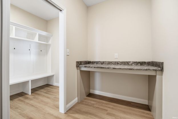 Brand new construction, the Santee floor plan by Majestic Homes offers over 2,000 square feet of thoughtfully designed living space with 3 bedrooms and 2.5 baths in a desirable ranch-style layout, ideally located in the Baker Farms subdivision within the newest phase of Frankfort’s Meadowbrook neighborhood. Vaulted ceilings highlight the open great room and kitchen/dining areas, where the great room features a gas log fireplace and triple windows overlooking the spacious 26x12 covered back porch. The kitchen is designed for both function and style with a large peninsula island with flush bar-top seating, quartz countertops, custom cabinetry, tiled backsplash, stainless steel appliances, and a generous walk-in pantry. The private owner’s suite showcases a 10-foot tray ceiling, a large walk-in closet, and a well-appointed bath with tiled walk-in shower, dual-sink vanity, separate stool area, and linen closet. Two additional bedrooms each offer walk-in closets and their own sinks while sharing a Jack-and-Jill bathroom, and a versatile den provides the flexibility to serve as a fourth bedroom or home office. Additional highlights include a large laundry room with cabinetry and folding space, a mudroom with built-in cubbies, a convenient half bath, and a 3-car garage with pull-down attic storage. Finishing touches include luxury vinyl plank flooring throughout the main living areas, a front-yard irrigation system, a water softener, and a covered back patio perfect for outdoor living—making this home a standout blend of comfort, quality, and modern convenience.