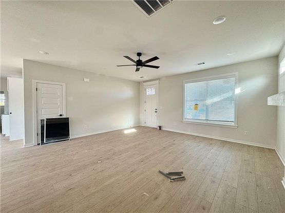 Fence, blinds and gutters included! Discover your dream home in the new neighborhood- Jacob's Crossing. Powell B plan with garage on the right and North facing! 9 ft ceilings, linear electric fireplace, LVP flooring throughout the main living areas and primary bedroom, quartz countertops and more. Chef's kitchen boasting frigidaire stainless steel appliances, gas range, pantry, quartz countertops, bar pull handles, tons of counter space and gorgeous backsplash. Luxurious primary bedroom features abundant natural light, while the spa-like primary bathroom offers a walk-in shower, tub, double sinks, and spacious walk-in closets. Additional features include a loft area, two large secondary bedrooms upstairs and a functional laundry room. Nestled on a generous lot with covered patio that overlooks the serene sodded, fully fenced backyard. Sturdy concrete siding and brick! Model home located at 3631 Tranquility St- Lot 1.