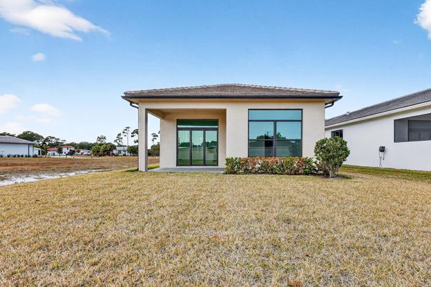 Your vision, your style, your brand-new home! This never-lived-in residence in the gated Rivella community is a standout for modern design and open space. Soaring 11'4'' ceilings create an immediate sense of scale in the grand entry, flowing into a 3BR layout plus a den with classic double French doors. The kitchen is designed for daily life and entertaining alike, featuring Quartz countertops and a gas range. Complete impact glass throughout offers security and modern efficiency. Set on an oversized lot with significant backyard depth, there is plenty of room for outdoor customization. Rivella residents enjoy a clubhouse, lakeside pool, and tennis. Ideally located near Stuart dining, Jensen Beach, and Clover Park, this home offers a fresh start in a premier location. Ready for move-in!