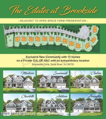 Welcome to The Estates at Brookside, an exclusive 15-lot enclave on a quiet, tree-lined cul-de-sac. The Charlotte model offers 4,500+ sq. ft. of luxury, featuring 6 spacious bedrooms and 6.5 designer baths. Highlights include a rare first-floor guest suite with an ensuite bath and an open-concept gourmet eat-in kitchen designed for entertaining. The expansive backyard is perfectly suited for a custom inground pool and your own private oasis. Built with unparalleled craftsmanship, this home is just minutes from local beaches, the Garden State Parkway, and top-tier dining. Several models and lots are available to customize your dream home. Experience the perfect blend of sophistication and comfort in the heart of Toms River's Brookside community.
