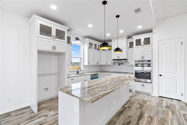 Beautiful new-construction home offering 4 bedrooms, 3 full baths, and approximately 2,048 sq. ft. of thoughtfully designed living space. The striking exterior showcases a modern blend of white stucco, black trim accents, warm taupe wood detailing, ledger stone, and multi-tone brick for impressive curb appeal. Inside, the open-concept layout features high ceilings, rich wood-look tile flooring, an electric fireplace, and abundant natural light. The spacious kitchen is designed for both everyday living and entertaining, complete with a large flat-top island bar, granite countertops, built-in microwave, stainless built-in oven, designer pendant lighting, subway tile backsplash, and extensive custom cabinetry including glass upper cabinets for added display and storage. A wall-mounted pot filler above the cooktop enhances the chef-inspired design, offering added convenience and a luxury detail you will appreciate. The private owner's suite offers vaulted ceilings and a spa-inspired bath featuring dual vanities, framed mirrors with upgraded lighting, and a beautifully tiled walk-in shower with modern matte black fixtures and a rain-style showerhead. The oversized walk-in closet is thoughtfully designed with built-in shelving, drawers, and hanging space for optimal organization. Additional features include energy-efficient construction, generous storage throughout, and a covered rear patio overlooking the backyard ideal for relaxing or entertaining. From striking finishes to functional design, this home offers the perfect balance of a modern lifestyle and comfort.