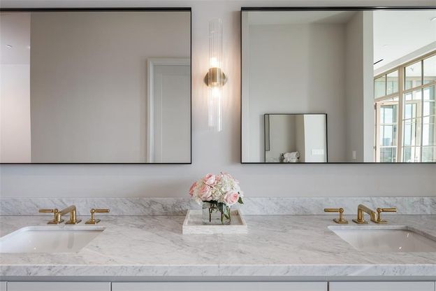 This exquisite home in The Terminal at Katy Trail was designed by acclaimed interior designer Gonzalo Bueno of X+III and is one of only three combined units in the building. The residence occupies the entire west side of the fifth floor, with views of downtown, the Katy Trail, and the Knox Street area. The expansive floor plan provides large open living areas with multiple seating areas and a wet bar for sophisticated entertaining. The dining room opens to a 499-square-foot-terrace overlooking the Katy Trail. The gourmet kitchen is well-equipped with Miele appliances, including a gas range. The spacious primary suite with downtown views includes a sitting area, a beautifully appointed bathroom opening to a terrace, an enormous closet, and coffee bar. Three secondary bedrooms are located on the north end of the residence, all with en-suite bathrooms and large closets. There is also a study with views of the Katy Trail. The Terminal at Katy Trail, designed by Austin-based architect Michael Hsu, also offers fabulous amenities such as yoga, Pilates, delicious dining options, 24-hour concierge, valet, and a state-of-the-art health and wellness day spa.