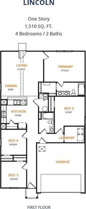 MLS# 21188034 - Built by NHC - Jun 2026 completion! ~ Model 1510-Lincoln -A1 The Lincoln Plan from our Liberty Series offers the perfect combination of efficiency, comfort, and value. This single-story home features 4 bedrooms, 2 bathrooms, a 2-car garage, and 1,510 square feet of thoughtfully designed living space. Upon entering, you’ll find three secondary bedrooms, a full-size bathroom, and a conveniently located laundry room. The heart of the home is the open-concept kitchen, which overlooks the dining area and spacious family room, making it perfect for hosting or everyday living. Toward the back of the home, the primary suite provides a private retreat, complete with an en suite bathroom. Access to the primary suite is conveniently located just off the living room, ensuring privacy and easy access.