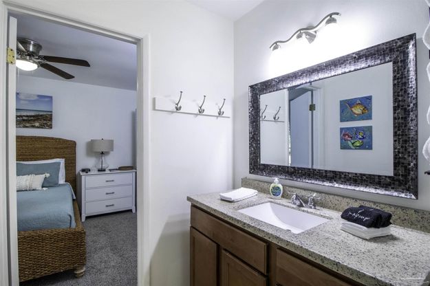 Fully furnished 3-BR/2 Bath townhouse overlooking the Perdido Bay Golf Course. This unit is only 10 min from the beach and comes completely furnished and ready for listing on Airbnb, including all linens, kitchenware, small appliances (Keurig, Ninja blender, etc), 5 new LCD TVs, stainless steel appliances (new microwave and dishwasher), full size washer and dryer, patio furniture, etc. Large great room has an 18 ft ceiling, updated LVP flooring, new leather furniture and a 75 inch TV mounted over a large entertainment center with an electric fireplace. Updated throughout with copper wiring in 2024. Master BR downstairs has a king bed and en suite bath. Two oversized BRs upstairs (one queen, one with two double beds) share a Jack-n-Jill bath. Large sunroom overlooks the 12th fairway and has a poker table, work desk and 50 inch TV.