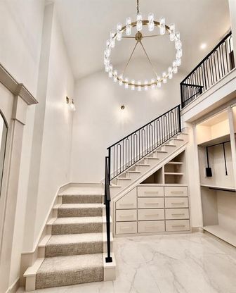 Welcome to this stunning custom built modern show stopper that perfectly blends timeless elegance with contemporary design. From the moment you arrive, the striking brick exterior, bold black accents, and warm wood beams create incredible curb appeal and a grand first impression. Step inside to soaring ceilings, abundant natural light, and an open concept floor plan designed for both everyday living and entertaining. The chef's kitchen is a true showpiece featuring an oversized island, quartz countertops, custom cabinetry, designer lighting, and premium appliances all flowing seamlessly into the spacious living area with a beautiful stone fireplace and wood beam ceiling detail. The private primary suite is a retreat of its own, highlighted by a rare two-story master closet complete with custom builtins and a staircase leading to the upper level offering unmatched storage and boutique style organization. Upstairs and throughout the home, you'll find thoughtfully designed spaces including: A dedicated theater room with elevated platform seating area, perfect for movie nights and game days, designer staircase with custom iron railing, high-end finishes and lighting throughout, and spacious secondary bedrooms and bathrooms. Outdoor living is just as impressive with a fully equipped covered patio featuring a brick outdoor kitchen, grill station, granite countertops, fireplace, wood paneled ceiling, and ample space for entertaining year round. This home offers luxury, functionality, and unforgettable design ideal for both entertaining and comfortable living.