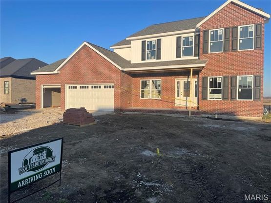 Introducing The Linden floorplan by New Tradition Homes, a stunning 5-bedroom, 3.5-bath new construction featuring 3/4 brick and thoughtfully designed modern finishes throughout. Currently under construction and scheduled for completion in May just in time for summer! The first floor offers 9’ ceilings and a seamless flow between the kitchen and living room, creating the perfect space for everyday living and entertaining. RevWood Plus flooring extends throughout the entire main level, complemented by craftsman-style trim and crisp white interior walls for a timeless, elevated look. The kitchen showcases 42” white cabinetry with a ventless hood over the oven, quartz countertops throughout the home, a ceramic tile backsplash, and a beautiful accent island that anchors the space in both style and function. Retreat to the spacious primary suite featuring a luxurious tile shower with frameless glass door, ceramic tile bathroom floors, and a custom wood shelving system with drawers in the walk-in closet for optimal organization. With 9’ ceilings in the basement, there is incredible potential for future finished living space adding even more versatility to this thoughtfully designed home.