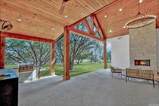 Experience the beauty of Texas Hill Country living in the highly sought-after Bridlegate community in Bandera, TX. This stunning 4-bedroom, 3-bathroom home, plus a convenient powder room near the kitchen, sits on over 2 acres of land, blending luxury with comfort. Inside, you'll be greeted by soaring vaulted ceilings with wood-faux beams that rise over 20 feet, giving the space a bright, airy feel. The living room is centered around a gorgeous stone, wood-burning fireplace that seamlessly extends to the outdoor patio-perfect for cozy nights in or entertaining guests. Step outside to the expansive back patio, which offers over 800 sqft of an outdoor living area and overlooks a private green space. It's the ideal setting for relaxation or hosting gatherings, with an outdoor kitchen ready for barbecues and a built-in sound system for added ambiance. The chef's kitchen is a true standout, featuring a large island with elegant quartz countertops, a gas range with a convenient pot filler, hand-crafted floating shelves, and premium Forno appliances that will convey with the home. This energy-efficient home is designed with foam insulation, stunning Mahogany doors, and beautiful wood flooring throughout. The 9-zone sprinkler system ensures your lawn stays lush year-round, and epoxy flooring in the 3-car garage adds the perfect finishing touches. Don't miss out on this rare opportunity to own a meticulously crafted home in one of Bandera's most desirable communities!